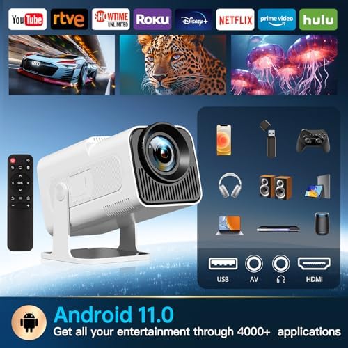 [180°Adjustable Stand]HIPPUS Smart Mini Projector with WiFi and Bluetooth, Full HD 1080P , Auto Keystone,4K Video Portable Ceiling Projector,Wifi 6,Android 11.0 (White)