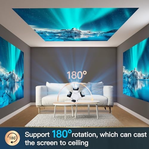【180° Rotating Ceiling Projection 】180° rotation support lie down at home and enjoy ceiling projection, providing viewing effect at any position; 7.3*3.8*5inch small size portable projector can be carried with your bag and can be used outdoors or courtyard.