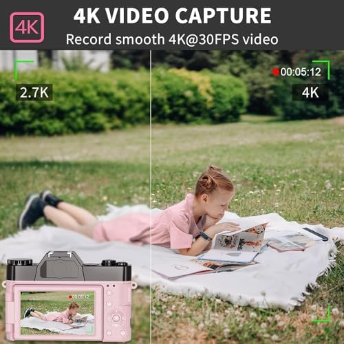 【Multiffunctional Point and Shoot Camera】:This 4K camera for photography supports time-lapse, slow-motion, and pause features to make your videos more creative. The vintage camera also supports a flashlight, anti-shake, 3 continuous shooting, smile & face detection, beauty face, self-timer, and various filters, all waiting for you to foster creativity.