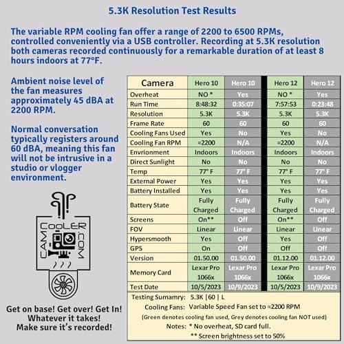 The CAMCooLER 9Ten11&12 is designed as an active cooling fan solution. Works with GoPro HERO9 Black, HERO10 Black, HERO 11 Black, and HERO12 Black camera overheating issues when used in a static environment. This cooling fan will help keep your action camera from overheating when recording sporting events, vlogging, creating YouTube content, as a dash cam, or in a small airplane! Whether you find yourself in a cozy studio environment or basking under the scorching sun at your next event, this fan has got you covered. With the ability to lower the fan speed, we have successfully minimized the noise output, ensuring a tranquil atmosphere for your studio endeavors while still helping to prevent your camera from overheating. Equipped with an included user-friendly controller, our variable fan offers a wide range of rpm options, ranging from a gentle 2200 rpm to an impressive 6500 rpm. While it is highly improbable that you will ever require speeds exceeding 5000 RPMs, we believe in providing you with the flexibility to adjust the output according to your preferences without compromising the electrical integrity of the fan. Embrace the power of choice and experience the perfect balance between cooling efficiency and noise reduction with our variable rpm fan. If the variable controller is unnecessary for every event, set it aside and connect the fan directly to the USB plug for a constant 5000 rpm fan. Made with ASA UV filament that has all the properties of ABS and is weather resistant. Our ASA is UV-resistant and resistant to environmental stress cracking. ASA is commonly used for outdoor applications such as RC planes or car accessories. ASA can resist temperatures up to 100˚C (212°F) and display high toughness and impact resistance for functional applications such as ABS. The Cooler is fully compatible with the Pro 3.5mm Mic Adapter from GoPro. We recommend using an external microphone so the fan noise doesn’t overwhelm the camera’s internal microphone. IP65-rated fans are waterproof against jets of water, but they are not rated for direct submersion in water. Please be aware that the cooling fan assembly may cause cosmetic marking, marring, and or light scratching to your GoPro case with repeated use. This is cosmetic and doesn’t impact the function of the camera. However, do not use our product if this concerns you. The cooling fans will suck in dust and coat the camera with a fine layer of dust, especially when players slide into Homeplate. It is highly recommended to have a battery door that has a passthrough for the power cable. This helps prevent dust migration into the GoPro camera. The Cooler will help reduce your devices’ operating temperatures and keep them recording. However, due to various atmospheric conditions and/or camera conditions, we cannot guarantee that your device will not overheat and shut off. CAMCOOLERLLC will not be held responsible for lost recorded video footage due to an overheated device. As a general guideline: Lower recording resolutions are advised for higher ambient temperatures! Sustaining 5.3K recording for extended periods above 100°F is likely not feasible. Conversely, 1080P at 115°F is highly effective. DO NOT stick your fingers or anything else in the fan blades at any time. Install the cooler over your device first and secure it using the method described in the instructions before applying power. Ensure your fingers and electrical cords are clear of the blades before applying power.