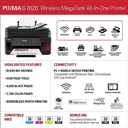 Canon G7020 All-in-One Printer Home Office | Wireless Supertank (Megatank) Printer | Copier | Scan, | Fax and ADF with Mobile Printing, Black, Works with Alexa