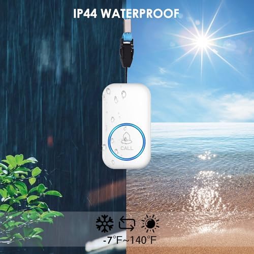 [Waterproof & 52 Melodies] The button is IP55 waterproof and can accept water/soup splashes, but it should be removed before bathing. The caregiver pager system offers 52 tunes to choose from.