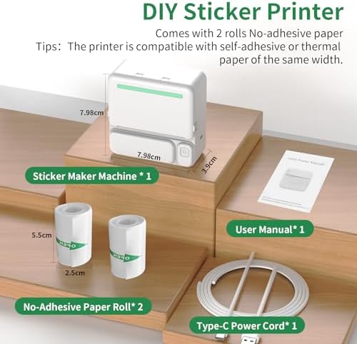 📦【What You Get】 1x Mini Sticker Printer, 2x Adhesive Thermal Paper, size 53*25mm (width X diameter), 1x USB cable, 1x Manual, 18-month warranty, free customer service for satisfaction guarantee.