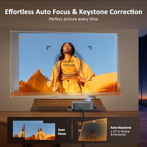【The Size】Transform any room into a cinematic experience with screen sizes ranging from 44 to 200 inches. The projector offers a 100% to 60% zoom function, allowing you to adjust the screen size to fit your needs perfectly. With auto keystone correction and electronic focus, you can easily achieve a clear and sharp image every time.