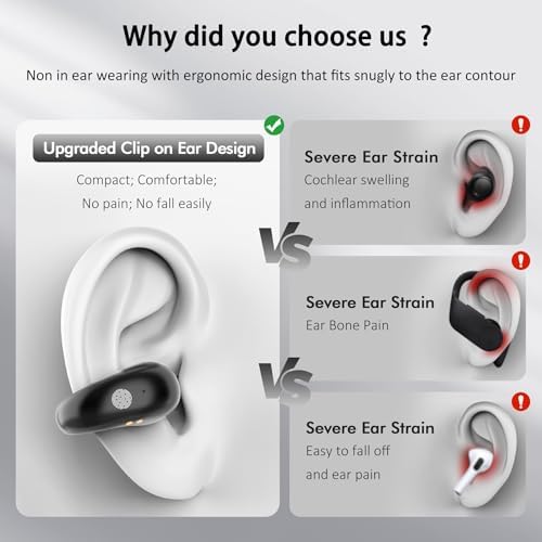 igh Fidelity Clear Calls and Wide Compatibility: Equipped with advanced dual built-in microphones, clip on ear bluetooth earbuds provide crystal clear hands-free calls. Additionally, the speaker delivers powerful, high-quality sound for an immersive audio experience. The wireless headphones bluetooth can be effortlessly connected to nearly any Bluetooth-enabled audio device, providing you with the versatility to use various types of devices as needed.