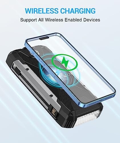 Advanced Wireless Portable Charger: Truly cable-free solar battery charger, the wireless output supports all Qi-enabled phones for inductive charging. Plus the built-in dual USB A outputs, and a USB C output with 5V/3A, it can charge 4 devices at the same time, which flawlessly meets the charging needs of your family and friends. This solar charger is compatible with iPhone 15/15 Plus/15 Pro/15 Pro Max, iPhone 14/13 series, Samsung Galaxy, and more.
