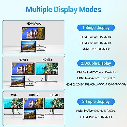 Triple Display & HD Resolution: Boosts your productivity by displaying on three external monitors through the HDMI and VGA ports at the same time. HDMI resolution will be 2K@60Hz and VGA will be 1080P@60Hz.