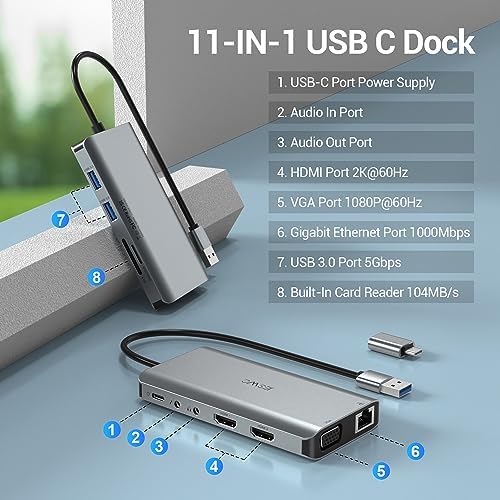 11-in-1 Docking Station: Supports instant expansion with 2 USB 3.0, 2 2K HDMI, a Gigabit Ethernet, a VGA, 3.5m Mic/Audio, USB-C power supply and SD/TF card reader to meet all your connecting needs in a dock.